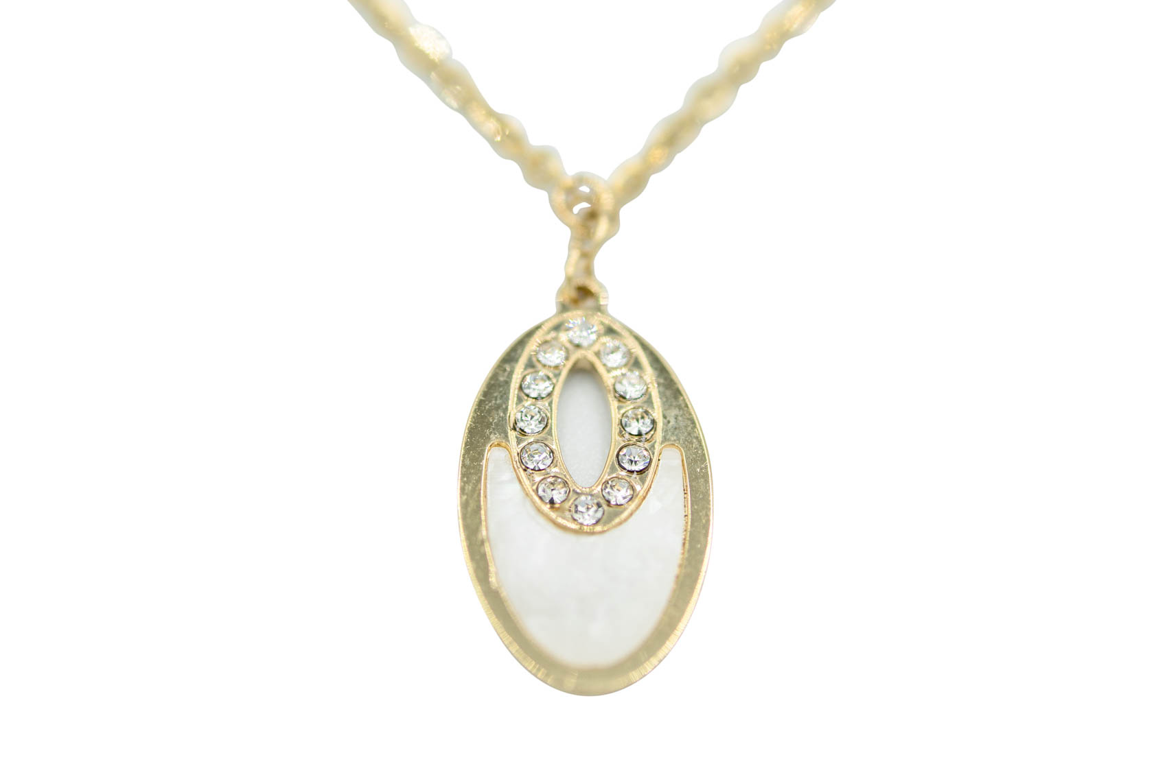 Κολιέ με χρυσή αλυσίδα 14 καρατίων, με μοτίφ οβάλ σχήματος, λευκή λεπτομέρεια και λευκά ζιργκόν.