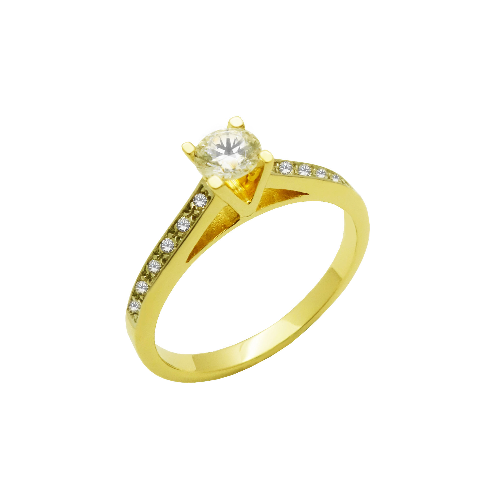 Μονόπετρο δαχτυλίδι κίτρινο χρυσό 14 καρατίων με κεντρική πέτρα ζιργόν και λευκά ζιργόν στο πλάι.
